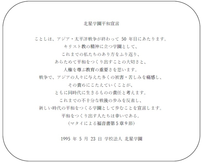 学校法人北星学園は、1995年5月、アジア・太平洋戦争終結から50年の節目にあたって「北星学園平和宣言」を発表しました。この宣言は、本学園の創立の精神と戦後の歩みを振り返り、平和を希求し続ける決意を表明したものです 。