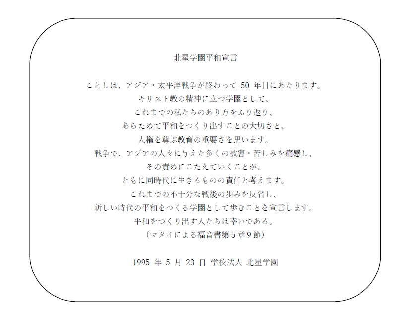 学校法人北星学園は、1995 年5月、アジア・太平洋戦争終結から50年の節目にあたって「北星学園平和宣言」を発表しました。この宣言は、本学園の創立の精神と戦後の歩みを振り返り、平和を希求し続ける決意を表明したものです。